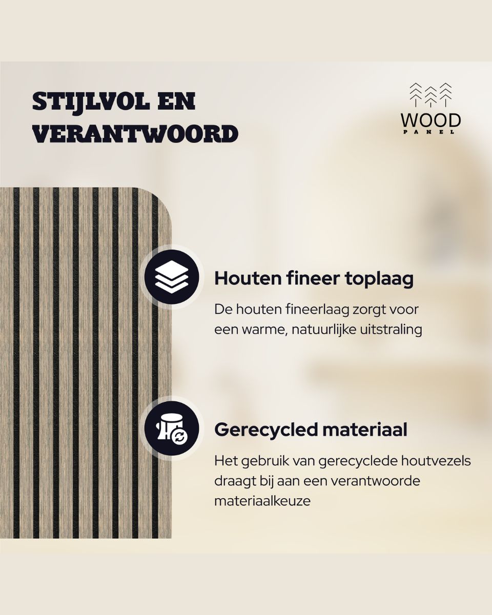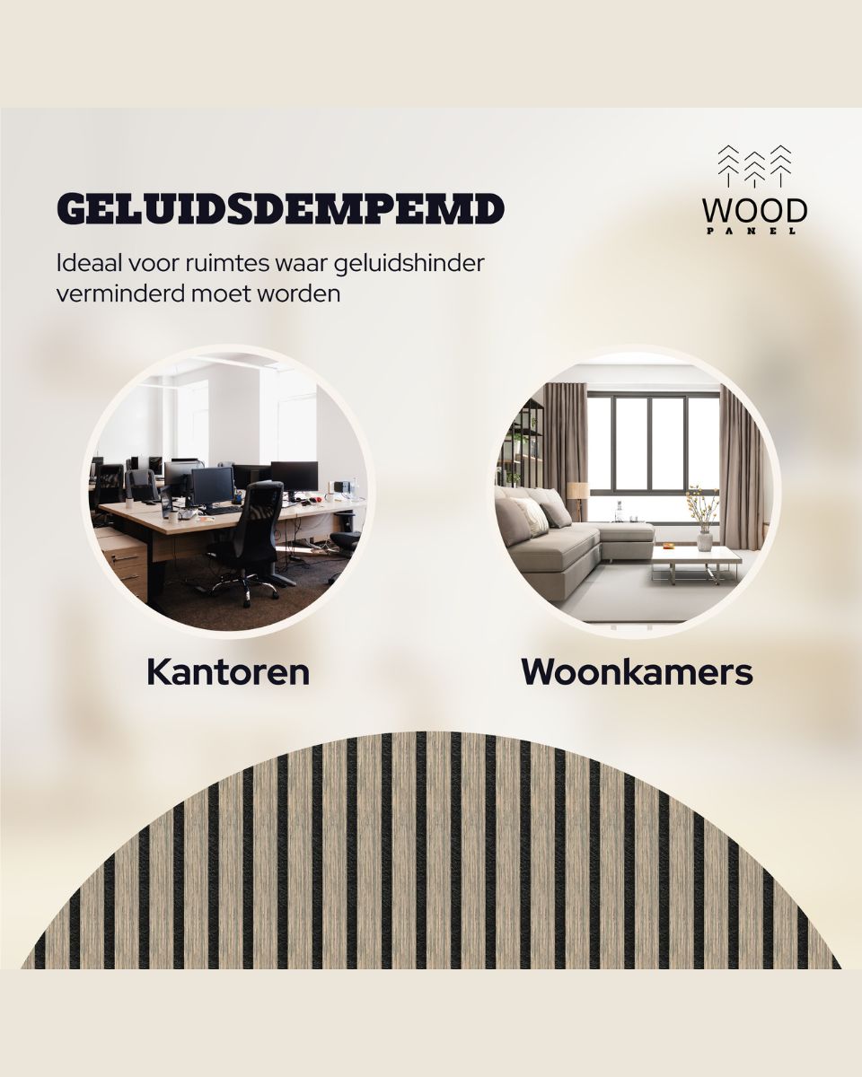 Akoestisch Wandpaneel 270x60 cm – Stijlvolle toepassing voor elk interieur Ons akoestische wandpaneel van Woodpanel is 270x60 cm en is ontworpen om zowel de akoestiek als de uitstraling van elke ruimte te verbeteren. Dit hoogwaardige paneel biedt een effectieve oplossing voor geluidsoverlast en galm, wat het een ideale keuze maakt voor kantoren, woonruimtes, vergaderzalen, restaurants en werkplekken waar geluid een belangrijke rol speelt. Met zijn strakke en moderne ontwerp past het moeiteloos in diverse interieurstijlen, van minimalistisch tot industrieel. Voordelen van het Akoestische Wandpaneel