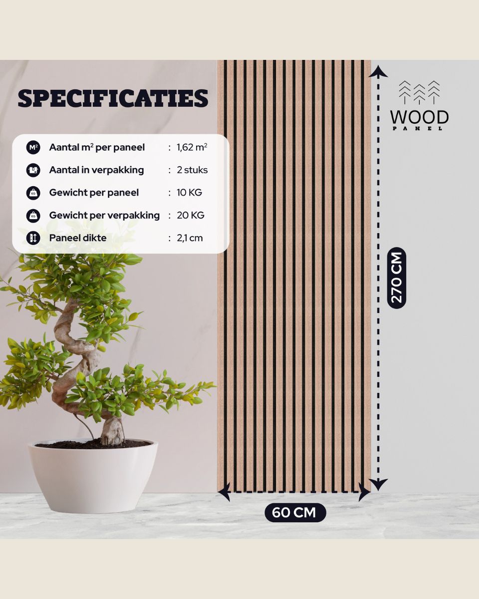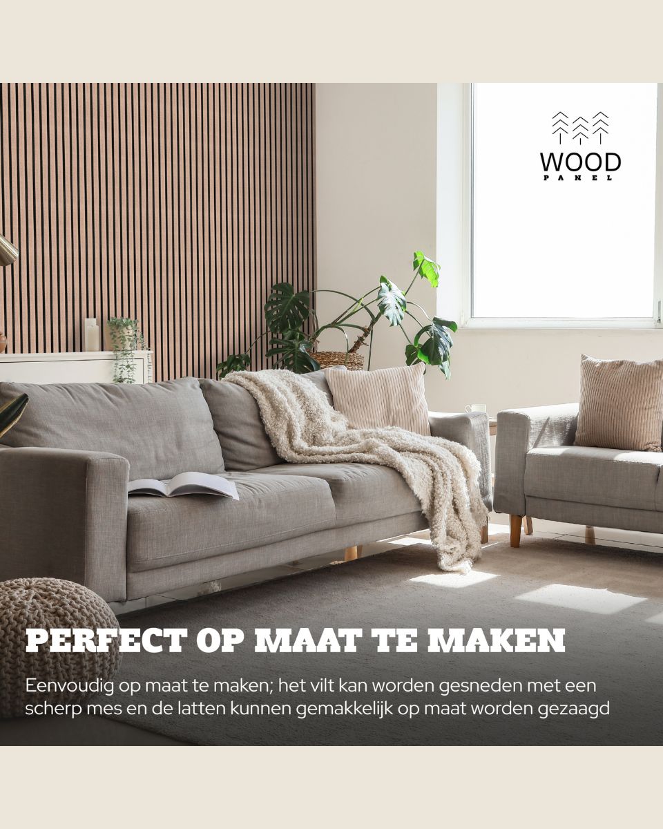 Ons akoestische wandpaneel van Woodpanel is 270x60 cm en is ontworpen om zowel de akoestiek als de uitstraling van elke ruimte te verbeteren. Dit hoogwaardige paneel biedt een effectieve oplossing voor geluidsoverlast en galm, wat het een ideale keuze maakt voor kantoren, woonruimtes, vergaderzalen, restaurants en werkplekken waar geluid een belangrijke rol speelt. Met zijn strakke en moderne ontwerp past het moeiteloos in diverse interieurstijlen, van minimalistisch tot industrieel.