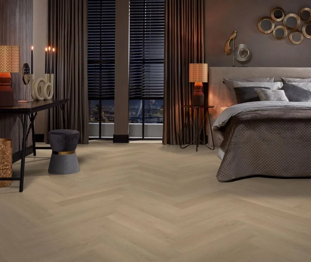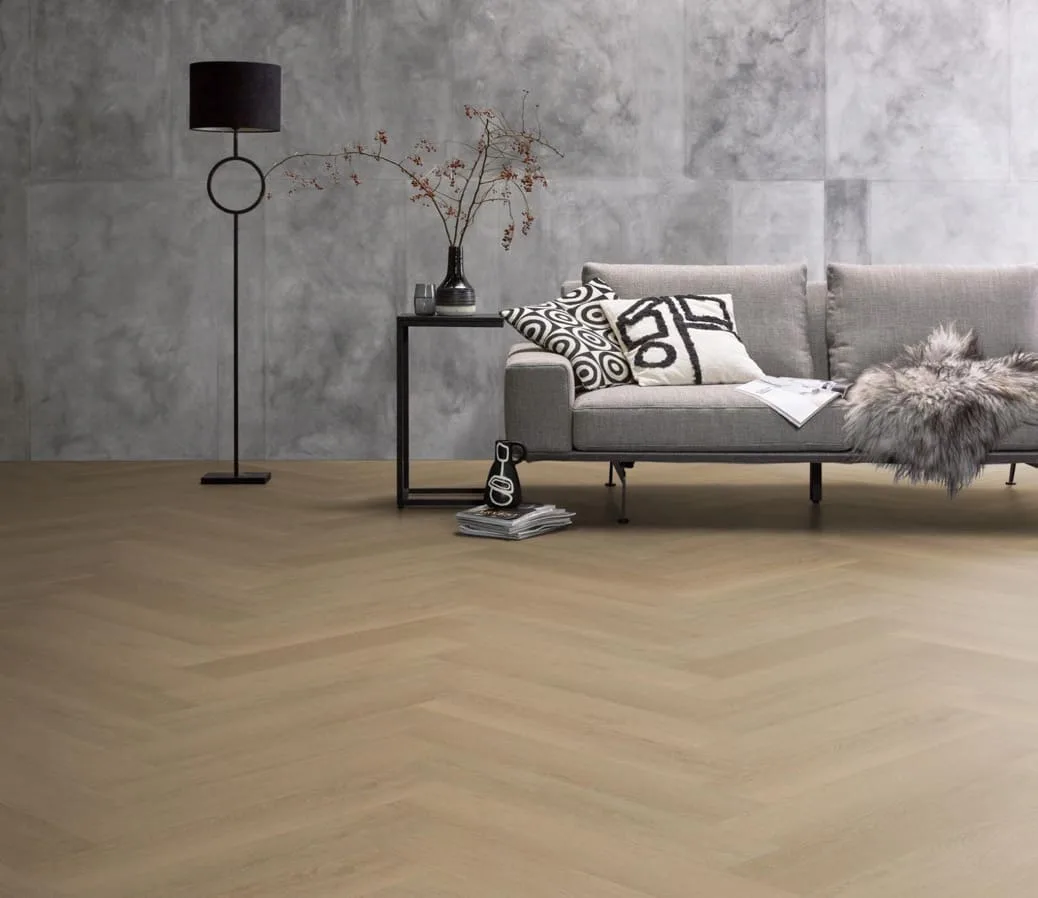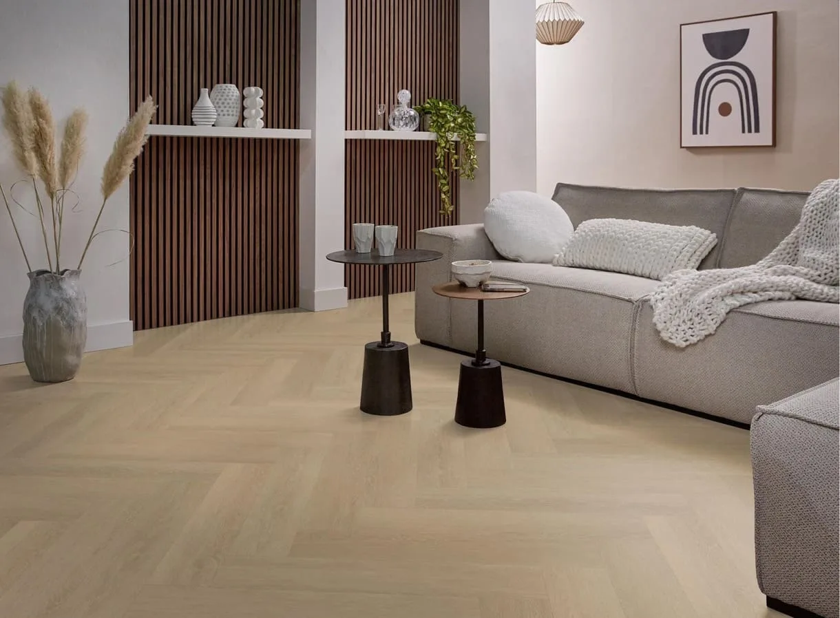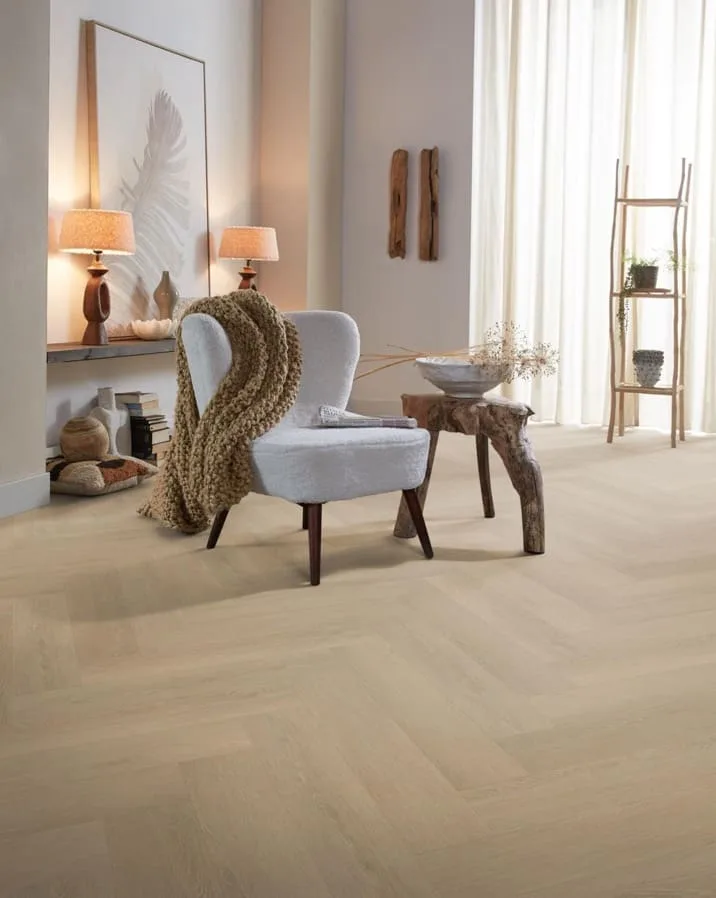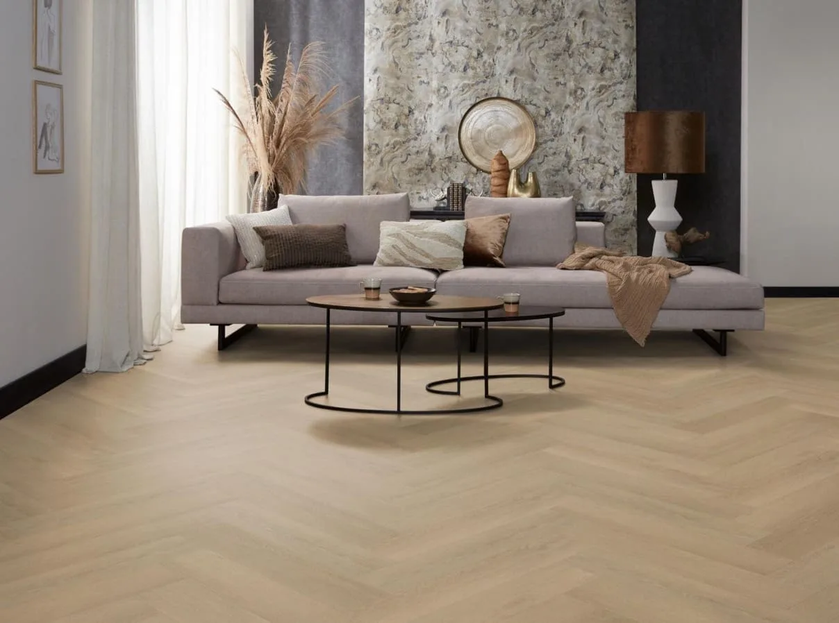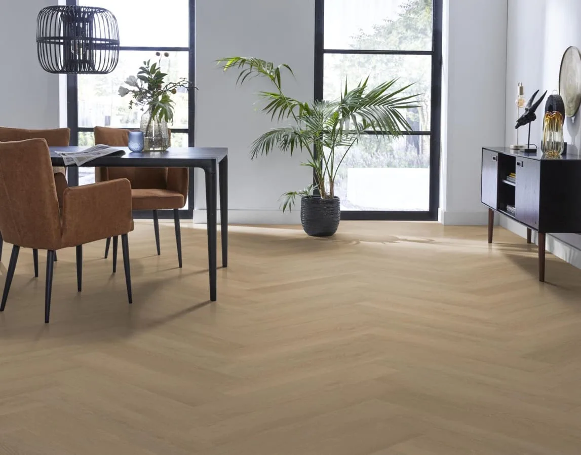 De Ambiant Herringbone Dryback Warm Natural PVC is een stijlvolle dryback PVC vloer met een klassiek herringbone-patroon en een warme, natuurlijke kleur die sfeer en karakter geeft aan je interieur. Door de verlijmde dryback-techniek ontstaat een strak en naadloos resultaat dat een luxe uitstraling heeft. Deze vloer is waterbestendig, slijtvast en onderhoudsvriendelijk, ideaal voor intensief gebruik in woon- en leefruimtes. Bovendien is hij geschikt voor vloerverwarming, wat bijdraagt aan extra comfort. De combinatie van tijdloos design en hoogwaardige kwaliteit maakt deze vloer perfect voor moderne en sfeervolle interieurs.