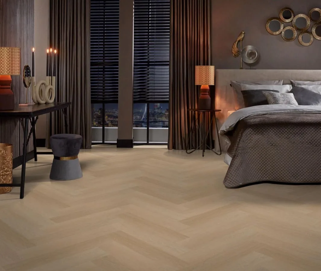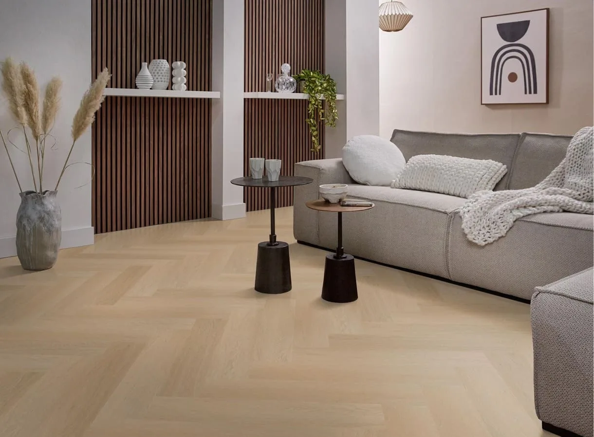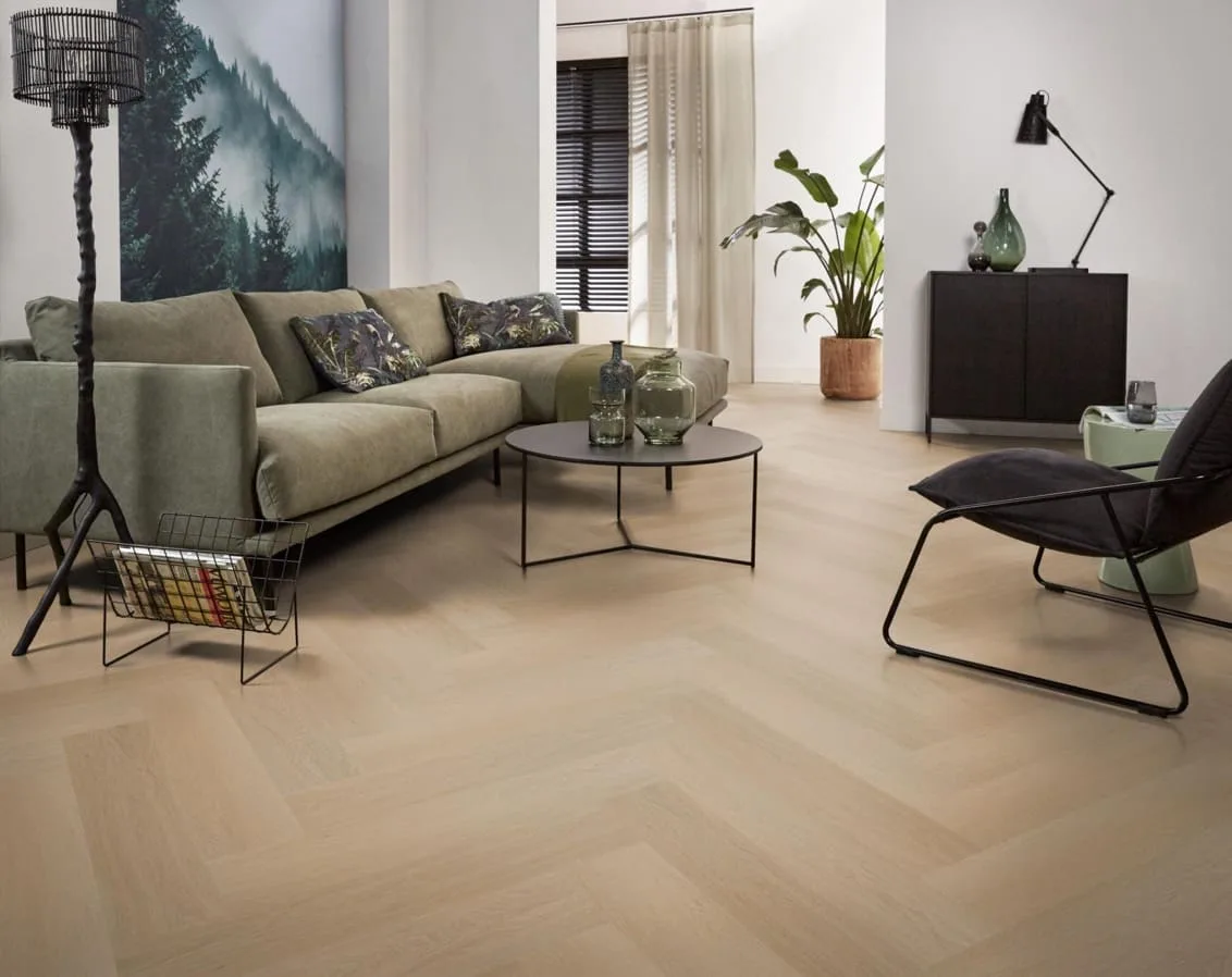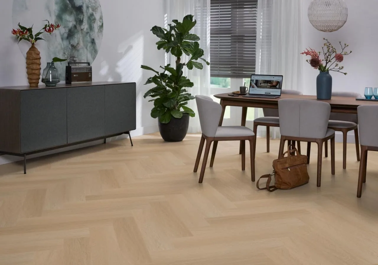 Maak kennis met de Ambiant Spigato Estino Visgraat Dryback Natural Oak PVC vloer, dé trendy keuze voor elk modern interieur. Deze visgraatvloer met zijn natuurgetrouwe dessin is een echte eyecatcher en voegt onmiddellijk een warme en uitnodigende ambiance toe aan jouw woonruimte.Met een authentieke houtlook en een matte afwerking lijkt deze PVC vloer bijna niet van echt hout te onderscheiden. Hij heeft een dikte van 7 mm en een robuuste slijtvaste toplaag van 0,55 mm, waardoor hij ideaal is voor dagelijks gebruik. Bovendien is de Spigato Estino perfect voor appartementen, met een geluidsreductie van 10 dB deltaL, wat zorgt voor een rustige en comfortabele omgeving.Kies voor de Ambiant Spigato Estino Visgraat Dryback Natural Oak PVC en upgrade jouw interieur met een stijlvolle, duurzame en praktische vloeroplossing.