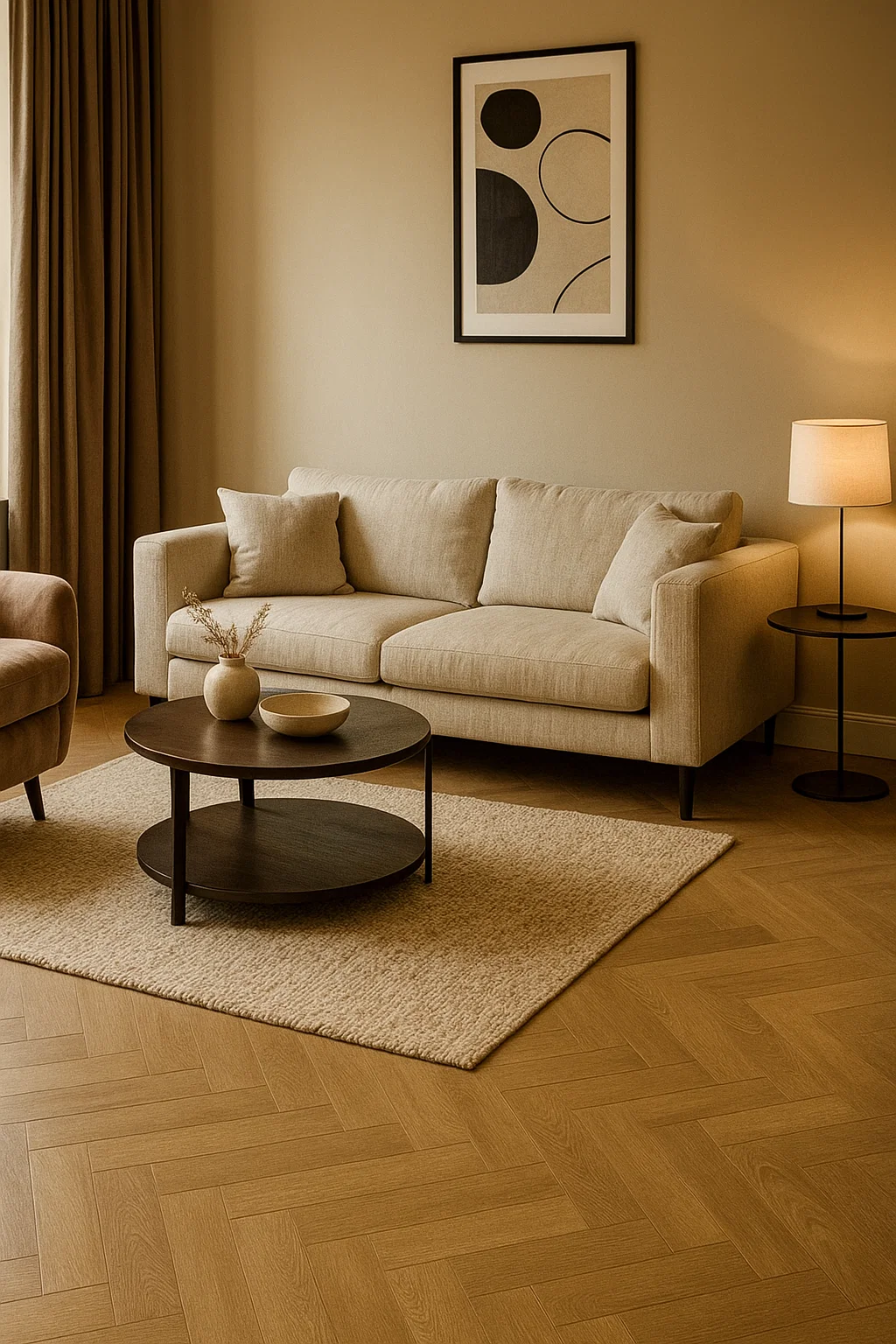 Tijdloos visgraatpatroon in beige houtlook, Stabiele, naadloze plaatsing door verlijming, Geschikt voor vloerverwarming en -koeling, Slijtvast, stil en onderhoudsvriendelijk