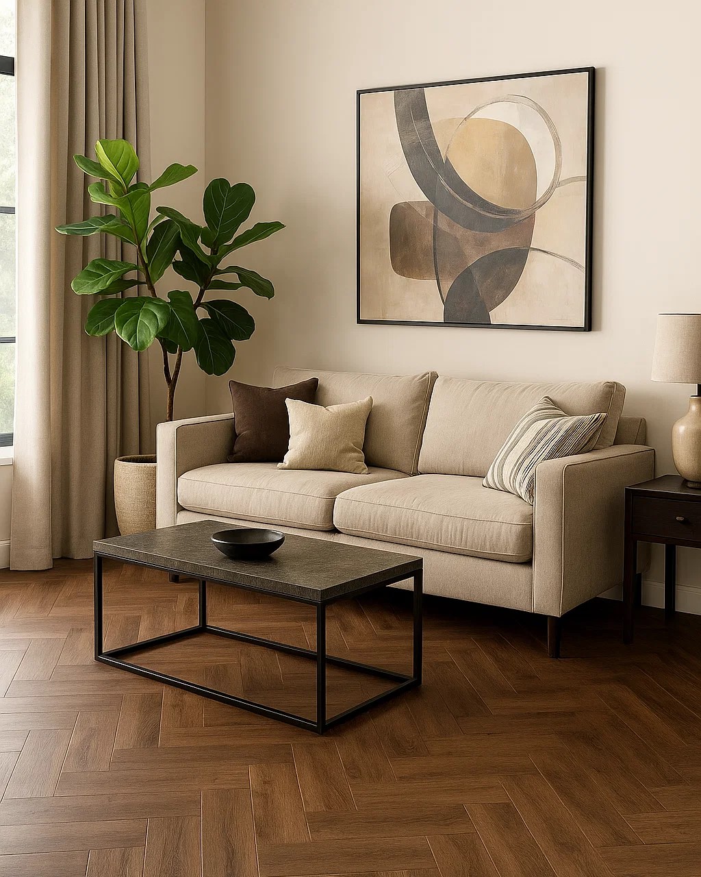 De Givefloors Pietra Visgraat 90 - Rigid Click PVC biedt een elegante en luxe uitstraling met zijn bruine visgraatpatroon, gecombineerd met een matlook en 4 V-groeven voor een authentiek effect. Met een lengte van 75 cm en breedte van 15 cm per plank en een dikte van 7 mm, zorgt deze vloer voor stevigheid en duurzaamheid. De vloer is uitgerust met een geïntegreerde ondervloer voor extra comfort en geluidsdemping, en is geschikt voor vloerverwarming voor het ultieme comfort.